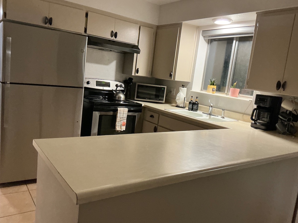 Votre aile privée de notre maison est orientée plein est, avec des fenêtres donnant sur de magnifiques vues du lever et du coucher du soleil vers les roches rouges de Sedona. Cette oasis au sommet d'une colline est arrosée par un petit ruisseau alimenté par une source et dispose d'un étang de carpes koï paisible. Profitez des étoiles depuis le jacuzzi ! Le bar pour le petit-déjeuner comprend un évier, une poêle électrique, un mini-réfrigérateur, un four grille-pain, un micro-ondes, un grille-pain, du café et du thé. Prenez un repas en ville et une bouteille de vin dans une salle de dégustation locale, et dînez avec votre propre vue privée de classe mondiale sur le patio.