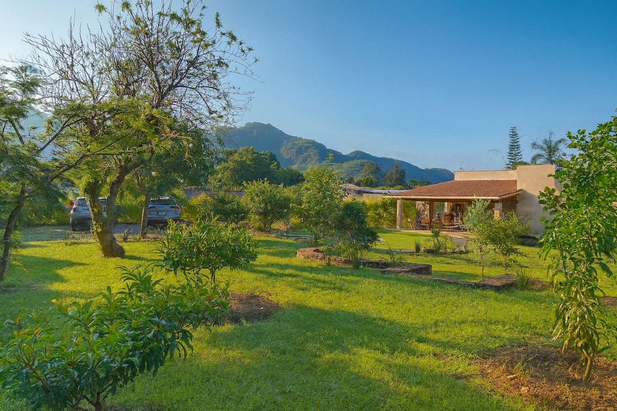 Maison de campagne dans un quartier calme de Malinalco. 1 350 M2. Salle à manger entourée de verre avec vue sur les jardins dans toutes les directions. Grande cuisine au centre et grandes vérandas. Deux chambres avec salle de bain complète. Salles de bains pour les invités. Deux chambres dans une « Maison du Hobbit » avec de beaux designs. Deux téléviseurs et un projecteur avec télévision par satellite et streaming. WiFi. Aire de jeux, chaise à bascule, hamacs, studio et belvédères. Un grand prunier et d'autres arbres. Plantes et fleurs. Parking pour 4 voitures.