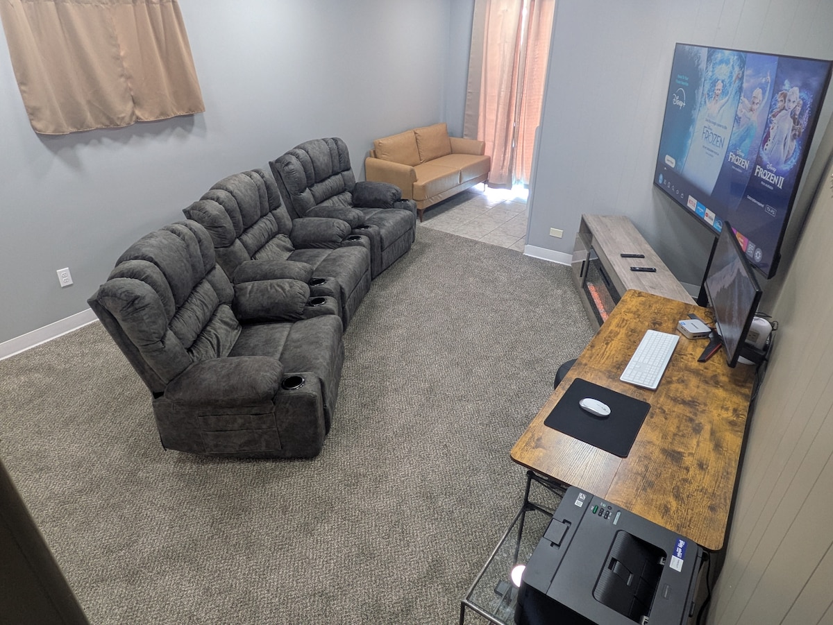 L'ensemble du groupe bénéficiera d'un accès facile à tous les sites et commodités depuis ce logement central. Dirigez-vous vers nos nombreux parcs d'État, faites une promenade en bateau sur la rivière Illinois, soyez aventureux et faites du parachutisme à Skydive Chicago et la liste est longue. Cette maison de deux chambres et une salle de bain vous accueille avec toutes les commodités pour vous sentir comme chez vous. Peut accueillir confortablement 3 adultes. (1 lit Queen Size et 1 lit double) Il dispose d'une cuisine entièrement équipée, d'un lave-linge/sèche-linge et de sièges/repas en plein air.
