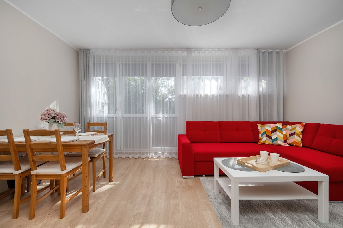 Profitez de votre séjour à Wrocław dans cet appartement paisible récemment rénové ! Découvrez la beauté des magnifiques couchers de soleil et la vue impressionnante depuis votre propre balcon privé. Quartier super sûr et calme avec beaucoup d'activités familiales en plein air, un terrain de football, un lac, un terrain de basket-ball, une aire de jeux et un terrain de beach-volley. Une connexion Wi-Fi rapide, une télévision connectée 4K 58’’, des articles de première nécessité, un canapé extensible et un parking sont inclus.