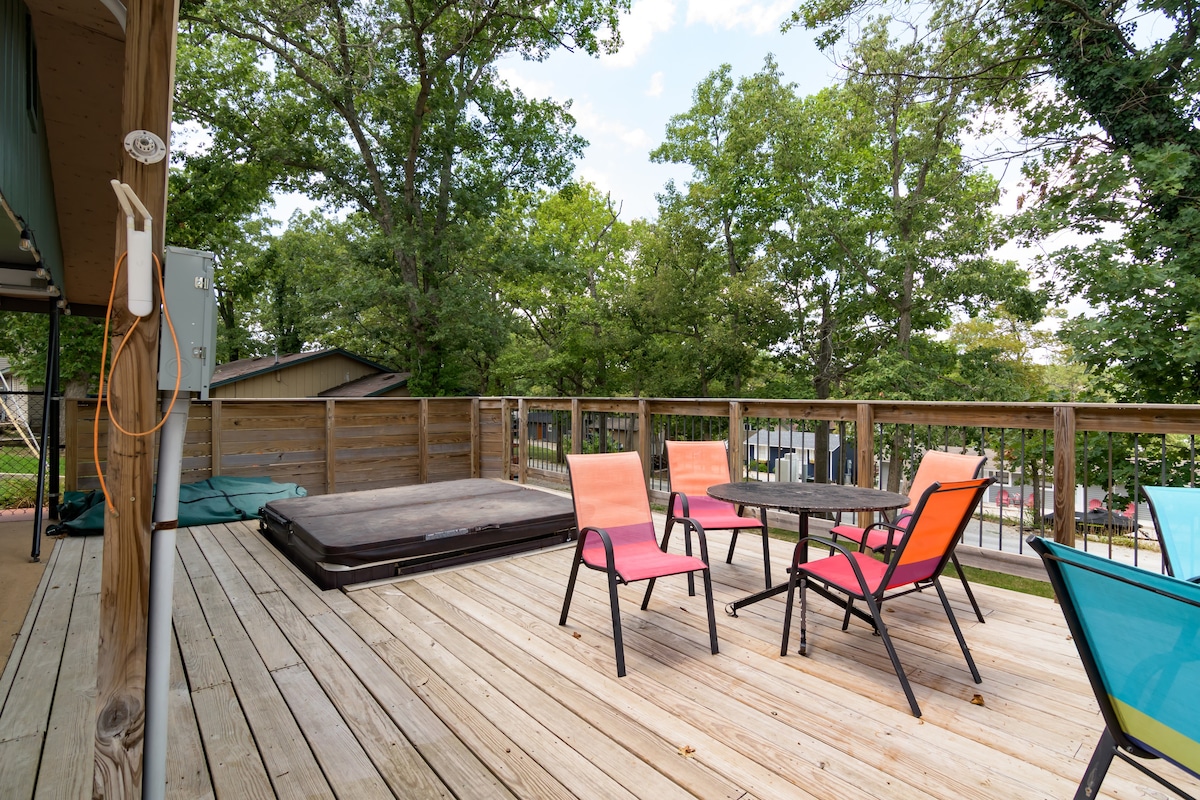 Profitez de 3 terrasses! Un porche couvert, Lever du soleil, au-dessus de la montagne Confidentialité, isolé sur 16 acres Convient aux chiens ! Salle de jeux pour enfants et adultes! Foyer extérieur et trampoline Bain à remous dans la chambre principale au rez-de-chaussée, Facile pour les personnes âgées : 2 marches sur le porche, porche inférieur, 1 marches jusqu'à une chambre. Cuisine bien approvisionnée Être ensemble, mais être séparés Facile d'accès à tout 5 min. Walmart 8 min. du centre-ville de Branson et de River Walk 7 min. de Silver-Dollar City 8 min. pour se rendre à l'endroit où tous les spectacles ont lieu