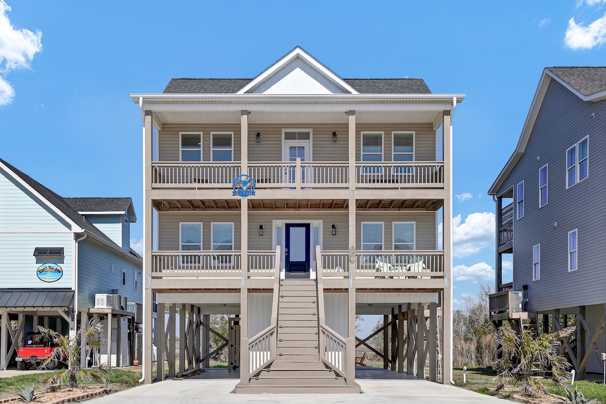 Préparez-vous à vous détendre dans cette maison de luxe de 4 chambres à Hampstead/Surf City. Le design architectural accentue la vue imprenable sur l'eau et les couchers de soleil parfaits. Deux terrasses extérieures offrent un grand espace pour se détendre, y compris un foyer, un hamac et un coin repas extérieur. Le quai du bateau est privé et dispose d'une table de nettoyage intégrée du poisson et d'un bar. La maison est située dans un quartier calme parfait pour la détente, mais à proximité de plages incroyables à Topsail Island et de nombreux restaurants, bars et divertissements.