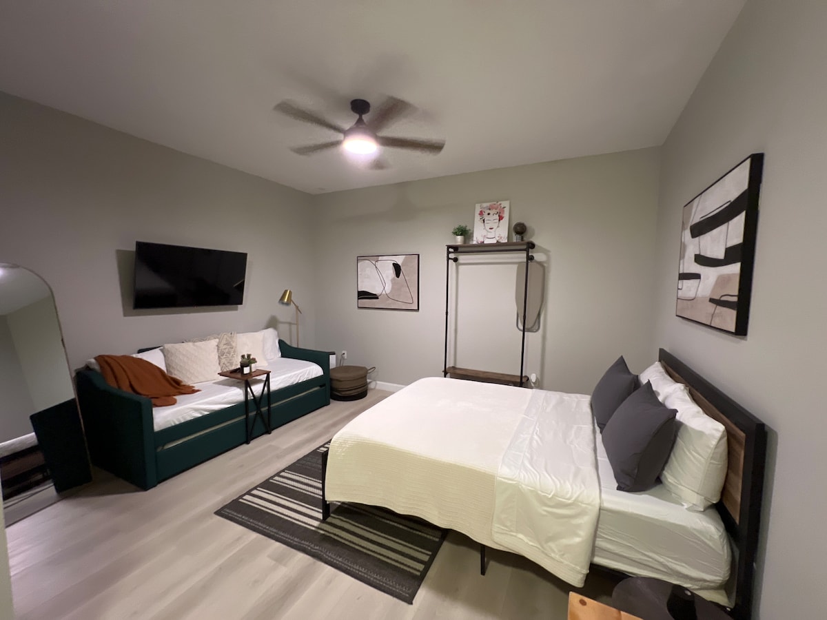 Notre retraite confortable dans la jungle urbaine vous place au cœur d'un quartier alimentaire impressionnant et est située au centre. Vous serez à quelques minutes en voiture/à pied de dizaines de restaurants variés et de plusieurs salles de concert. Notre suite indépendante est idéale pour les voyages d'affaires (5 min du centre-ville) et de loisirs (30 min des parcs à thème). La pièce principale de la suite dispose d'un espace pour se prélasser, d'un bar et d'un petit bureau. Elle communique avec une chambre avec un lit Queen Size et une salle de bains attenante.