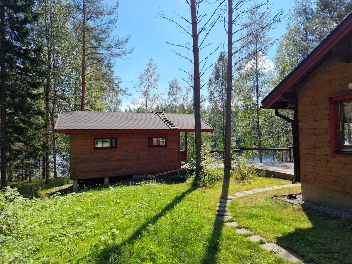 Un chalet confortable entre les pins et le lac à 2 pas de Saimaa. Il est assez petit à l'intérieur (30 mètres carrés) avec une grande terrasse ouverte et une pelouse verte devant. Il y a un lit Loft pour 2 personnes avec vue, une petite cuisine, une cheminée, un sauna sur bois à l'intérieur de la cabane. Il est agréable de commencer votre journée par une baignade matinale et du yoga/petit-déjeuner sur la terrasse en écoutant les chants des oiseaux et de terminer votre journée avec un verre de vin en prenant des photos d'un coucher de soleil époustouflant.