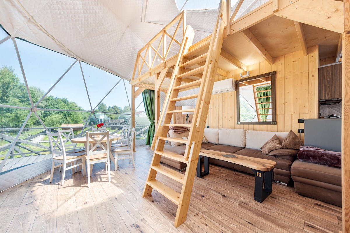 Les maisons en forme de dôme, ou tentes sphériques, offrent toute la gamme d'équipements disponibles dans les meilleurs appartements d'hôtel, mais sur une plus petite surface et entourées par la nature. Camping, nature sauvage, air frais combiné avec une cuisine et une salle de bain entièrement fonctionnelles, télévision, Internet, piscine, sauna et jacuzzi, cela semble abstrait ? Pas chez nous ! Notre Glamping est la solution idéale pour les personnes qui apprécient à la fois le confort et la proximité de la nature.