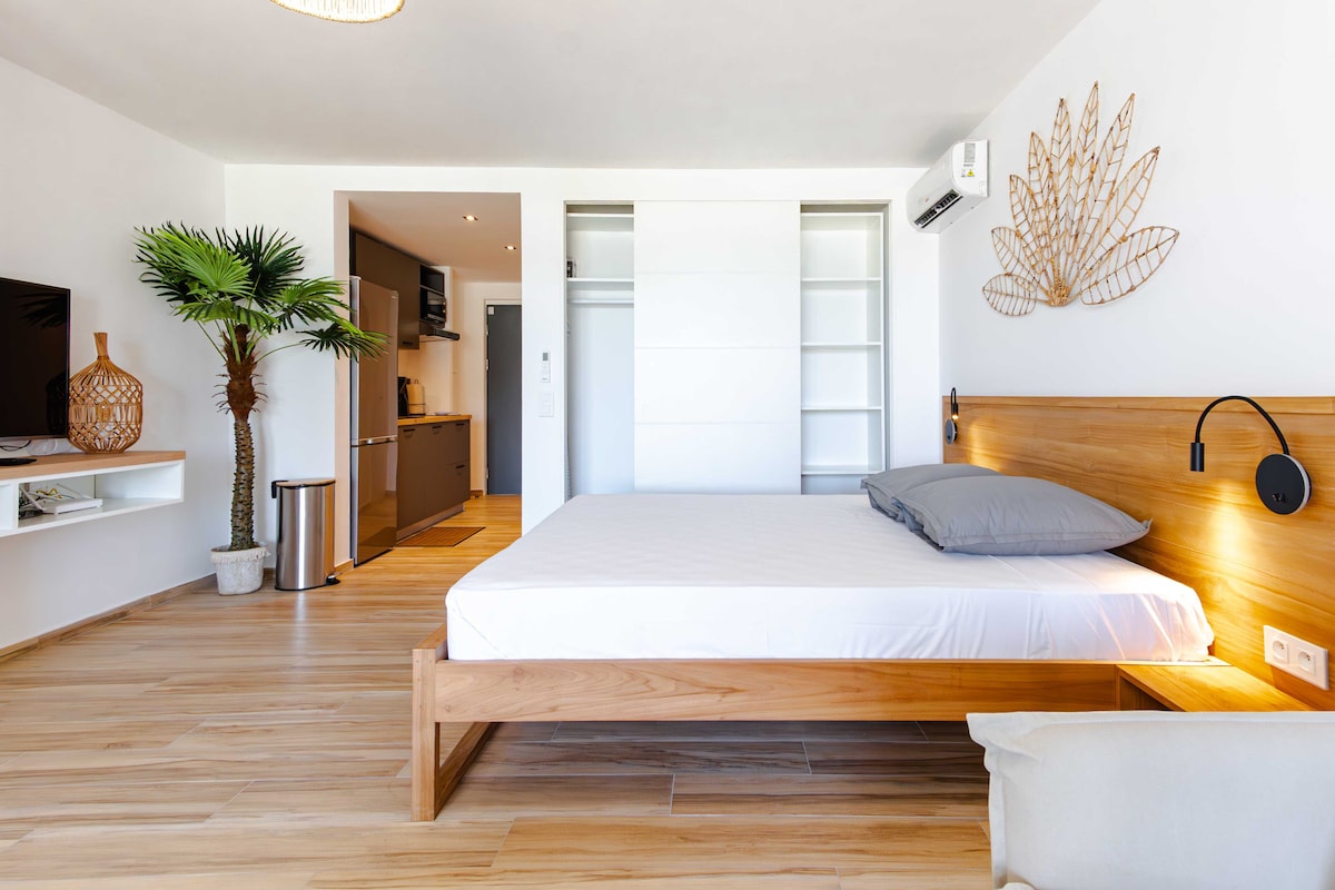 SUR LA PLAGE BAIE ORIENTALE - Appartement rénové au 1er étage - Vue mer et piscine, accès plage - Grande chambre avec accès terrasse, lit king size - Salle de bain avec wc - Séjour avec cuisine ouverte, canapé convertible - Grande terrasse traversante - Wifi, clim, TV connectée - Résidence sécurisée, parking, piscine Plage, commerces et restos accessibles à pied !