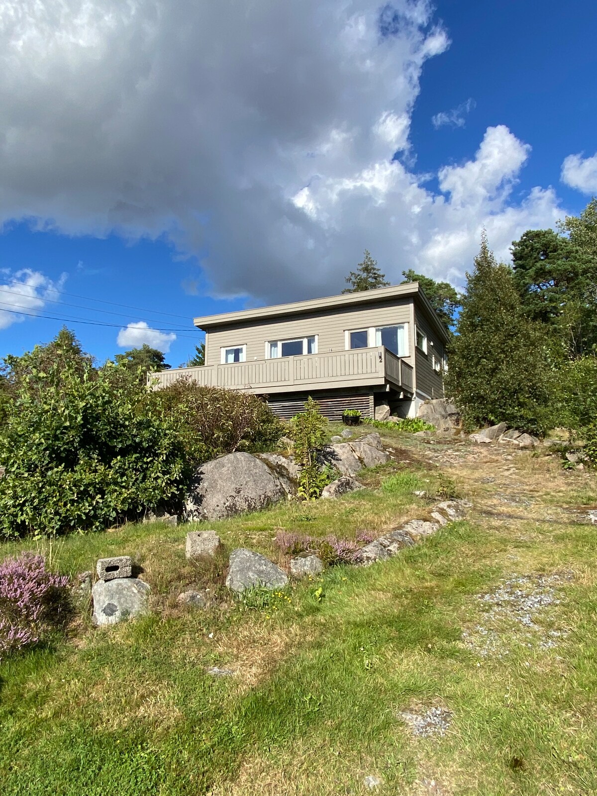 Joli chalet sur grand terrain, confortable et adapté aux enfants avec soleil chaque heure de la journée. Le chalet a été substantiellement rénové au cours des dernières années, avec une nouvelle cuisine, des salles de bains plus récentes et des chambres lumineuses et agréables. Il y a trois chambres à coucher dans la cabine principale, et une annexe avec quatre lits ainsi qu'un cabinet de toilette privé. Le chalet dispose d'une grande véranda avec plusieurs groupes de places assises. Bien sûr, c'est agréable d'être ici en été, mais la cabine est bien isolée, avec du feu de bois ainsi qu'une nouvelle pompe à chaleur. C'est donc une option parfaite en automne et en hiver également.