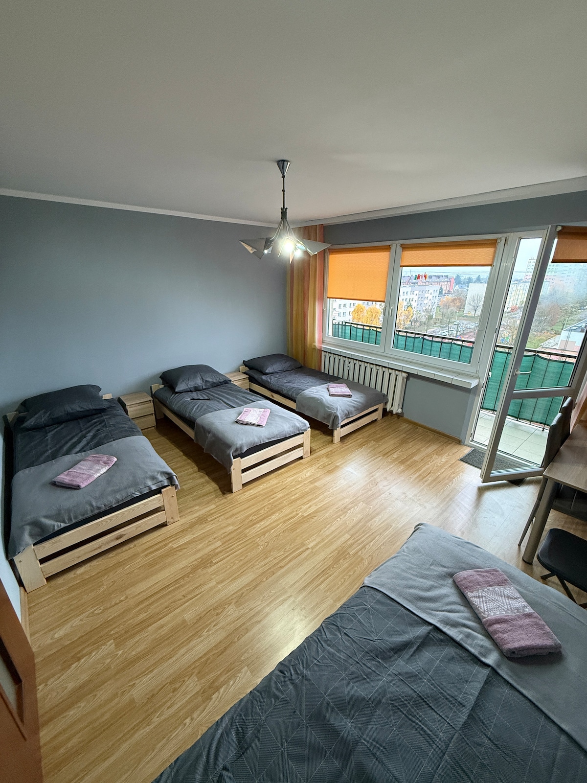 Nowe, komfortowe mieszkanie na wynajem krótkoterminowy, idealne dla firm. Pod budynkiem dostępne są dwa duże parkingi. W najbliższej okolicy znajdują się liczne sklepy, punkty usługowe i pasaż handlowy. Kuchnia jest w pełni wyposażona – kuchenka gazowa, piekarnik, zmywarka, lodówka, mikrofalówka Mieszkanie posiada Wi-Fi, w każdym pokoju telewizor Smart TV Układ mieszkania obejmuje: – pokój czteroosobowy z dużym balkonem, – pokój dwuosobowy, – pokój jednoosobowy z łóżkiem dwuosobowym.