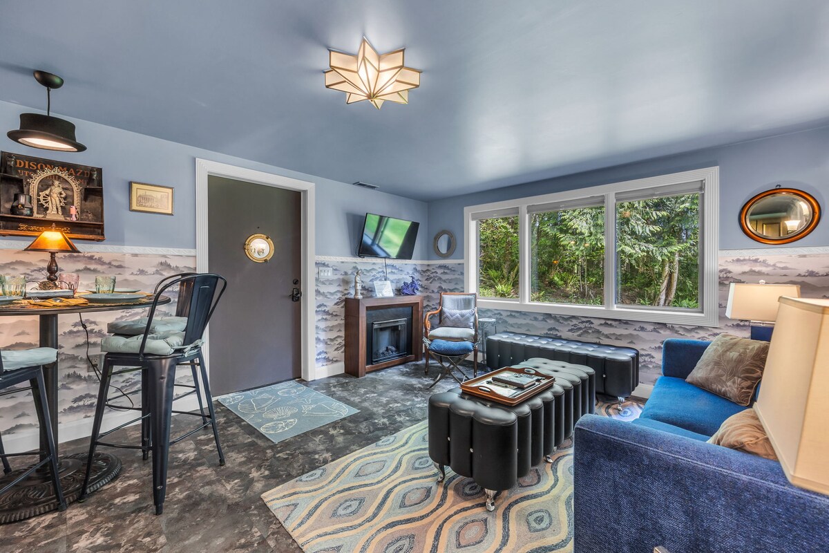 Stunning Ocean View, No Cleaning Fee, Cozy Oceanfront Cottage Apt, overlooking the Pacific Ocean. Private Balcony, chairs and (Electric BBQ summer only). Main room has a King Bed with Kitchenette ,Electric Fireplace, Sofa , Peacock TV and dining table. There is a Bathroom with Shower, Bedroom has a Queen Bed and minifridge/freezer. Kitchenette has salt,pepper,oil, utensils,dishes,cookware,mini oven,Instapot,toaster microwave, Minifridge, two burner stove, drip coffee maker.