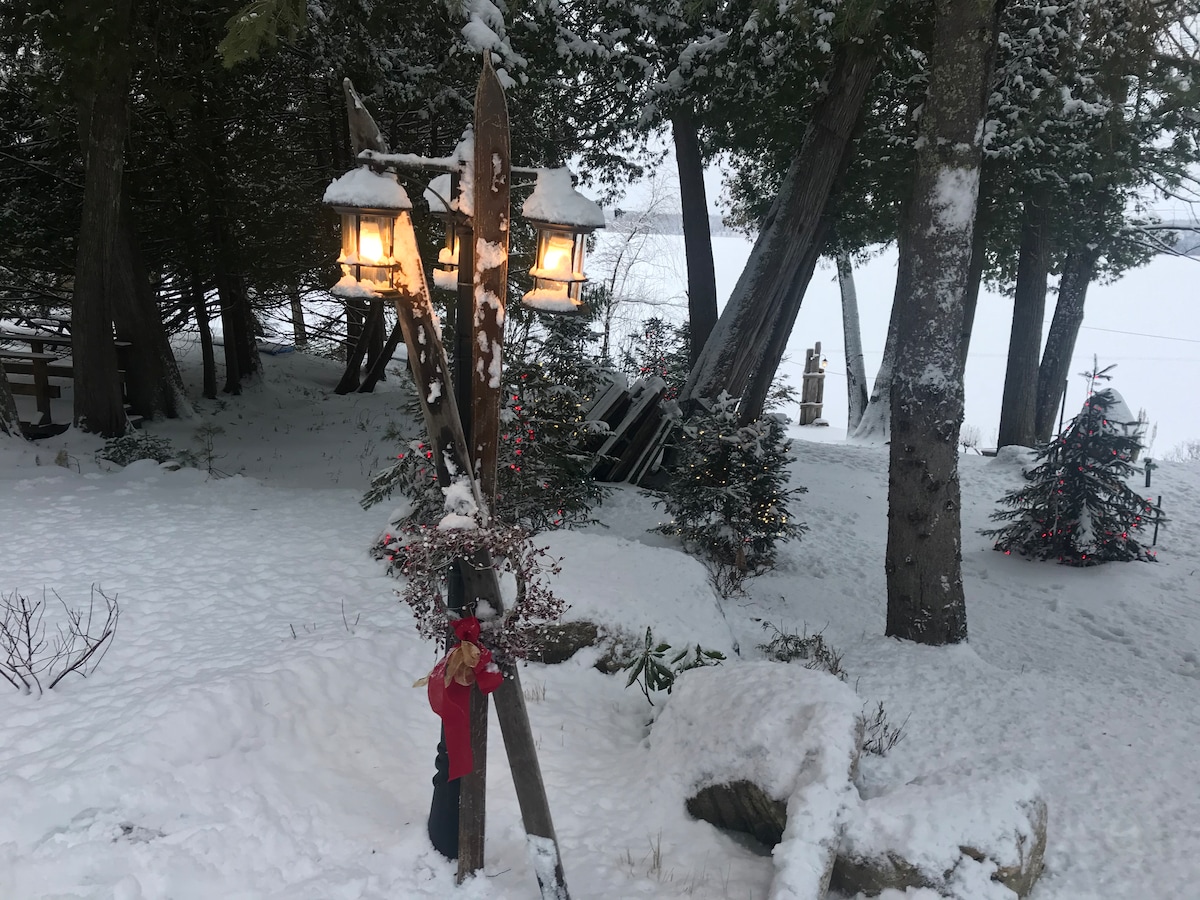 **Pas de frais supplémentaires autres que les frais Airbnb ** Détendez-vous dans un mini-cottage pittoresque de studio entouré d'eau de 3 côtés ! Profitez de la fraîcheur du printemps, des activités nautiques estivales et des magnifiques couleurs d'automne dans le pays des chalets. Parfait pour 1 ou 2 personnes ; emplacement de la péninsule et grandes fenêtres donnant une vue sur le lac à 270 degrés. Wifi, 1 place de parking, kitchenette, 3 pce bthrm, lit queen size, lit futon, télévision par satellite. Privé pour les invités : rivage, île, quai, barbecue, VTT, hamac, foyer, canoës, kayaks, tubes.