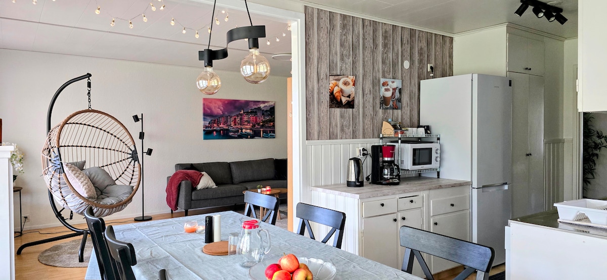 Découvrez le plus grand lac de Suède! À seulement 200 m du lac Vänern, notre maison lumineuse de 3 chambres à Otterbäcken est parfaite pour les familles et le travail à distance. Points forts : 🔹Emplacement : 4 minutes à pied de l'eau, de la plage, du port et des couchers de soleil. 🔹Prêt pour la famille : jardin privé, terrasse couverte, barbecue, lit bébé et chaise haute. 🔹Travail à distance : Wi-Fi rapide 150/100 Mbit/s et espace de travail. 🔹Espace : peut accueillir 6 personnes + un bébé (1 lit queen size, 1 lit superposé, 2 lits au sol). 🔹Confort : 1,5 salle de bain, cuisine complète et serrure intelligente. 🔹Commodité : stationnement gratuit. Location de linge disponible.