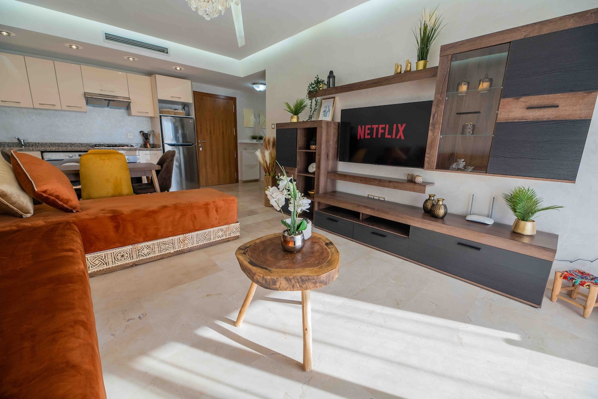 Vivez l'élégance avec la touche marocaine dans l'endroit luxueux de Marrakech ( La palmeraie). Entourés des palmiers , vous profitez : - Canapé moderne convertible en lit deux double - Chambre élégante avec matelas haut de gamme - TV Smart Wifi, Netflix et IPTV - Cuisine entièrement équipée - Grande Salle de bain - Terrasse vue panoramique pour profiter des petits déjeuner et vos pauses. La résidence offre une très grande piscine, grand jardin et un parking gratuit sur place