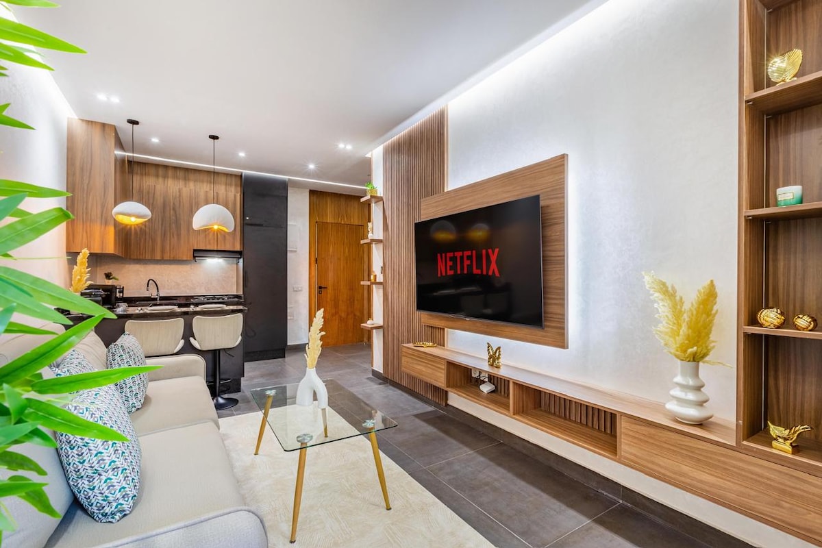 ✨Familles & Marrakech - Élégance, espace et sérénité Pensé pour accueillir les familles en quête de confort et de raffinement, cet appartement spacieux offre une atmosphère chic et chaleureuse. Le salon lumineux invite aux moments complices, la chambre élégante assure des nuits paisibles, et le coin repas fonctionnel facilite le quotidien avec enfants. Situé dans un quartier calme, ce logement entièrement équipé est un véritable cocon premium pour se détendre et découvrir Marrakech à son rythme.