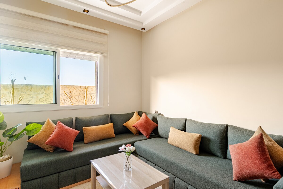 Cette villa bien équipée, située à 5 minutes en voiture de la plage et proche du centre-ville, est idéale pour vos vacances. - Lit double et 2 lits simples pour des nuits paisibles - Smart TV Samsung - Cuisine équipée - Salle de bain - Lave-linge - Wi-Fi Fibre optique - Pack d'accueil : bouteille d'eau, fruits et en-cas Note : Les couples marocains mariés doivent présenter un acte de mariage. Réservez dès maintenant et profitez d'un séjour inoubliable!