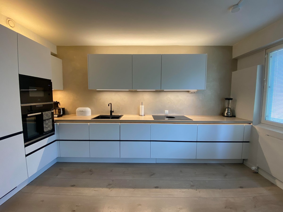 Logement paisible bien équipé près du centre d'Oulu. Un excellent moyen de transport, un sauna, un balcon vitré, une télévision connectée 55"et d'autres appareils électroménagers de haute qualité assurent le confort dans le logement. Dans le salon, un grand canapé convertible en lit qui permet à 4 personnes de passer la nuit. L'appartement dispose d'un climatiseur séparé pour refroidir rapidement l'espace ! Garage de stationnement pour les invités à utiliser sur demande, le parking est directement accessible par ascenseur.