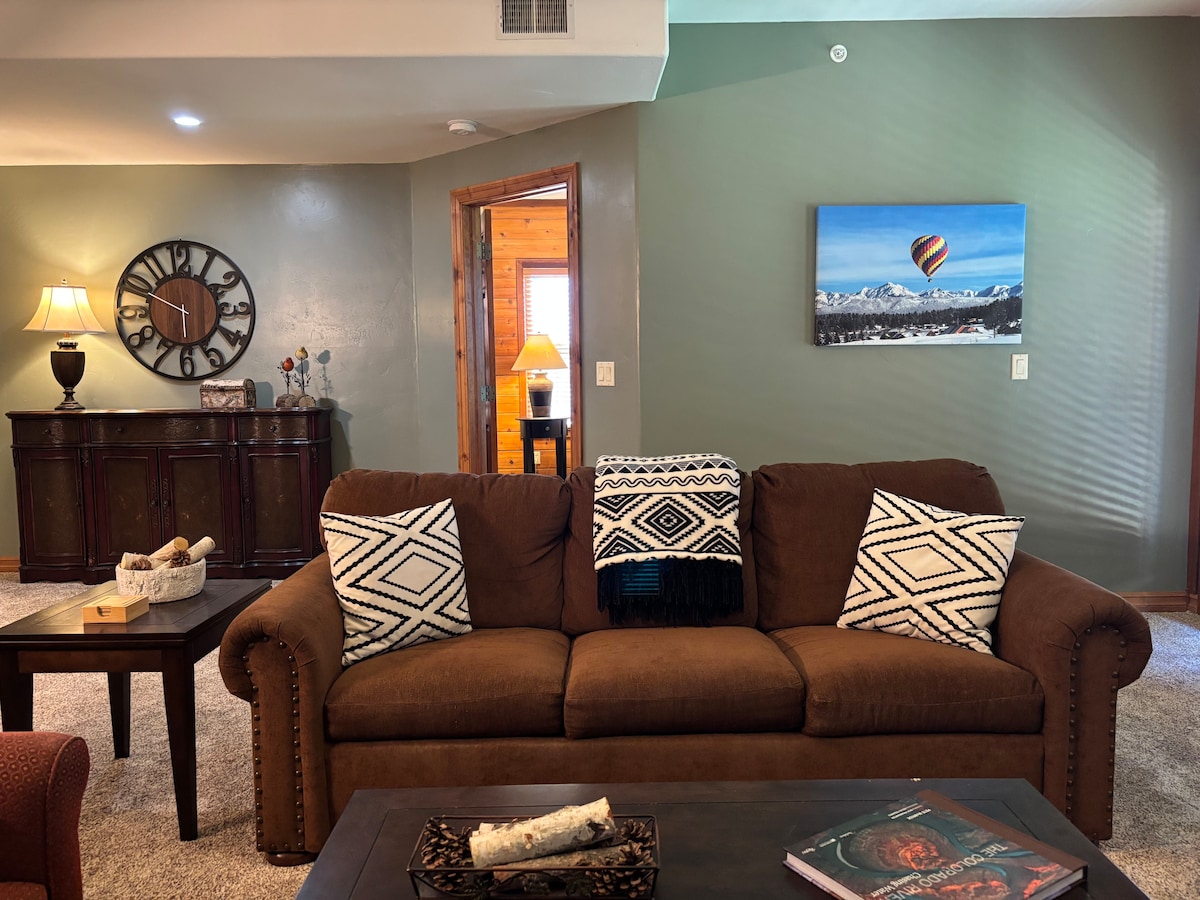 This welcoming two-bedroom, two-bath condo is tucked right along the Pagosa Springs Golf Course in the Uptown area, offering both convenience and comfort for your Pagosa Springs mountain getaway. The condo is on the second floor, giving you extra privacy and views, and the building has an elevator, so you’ll never have to worry about hauling your golf bags, snowboards or luggage up the stairs.