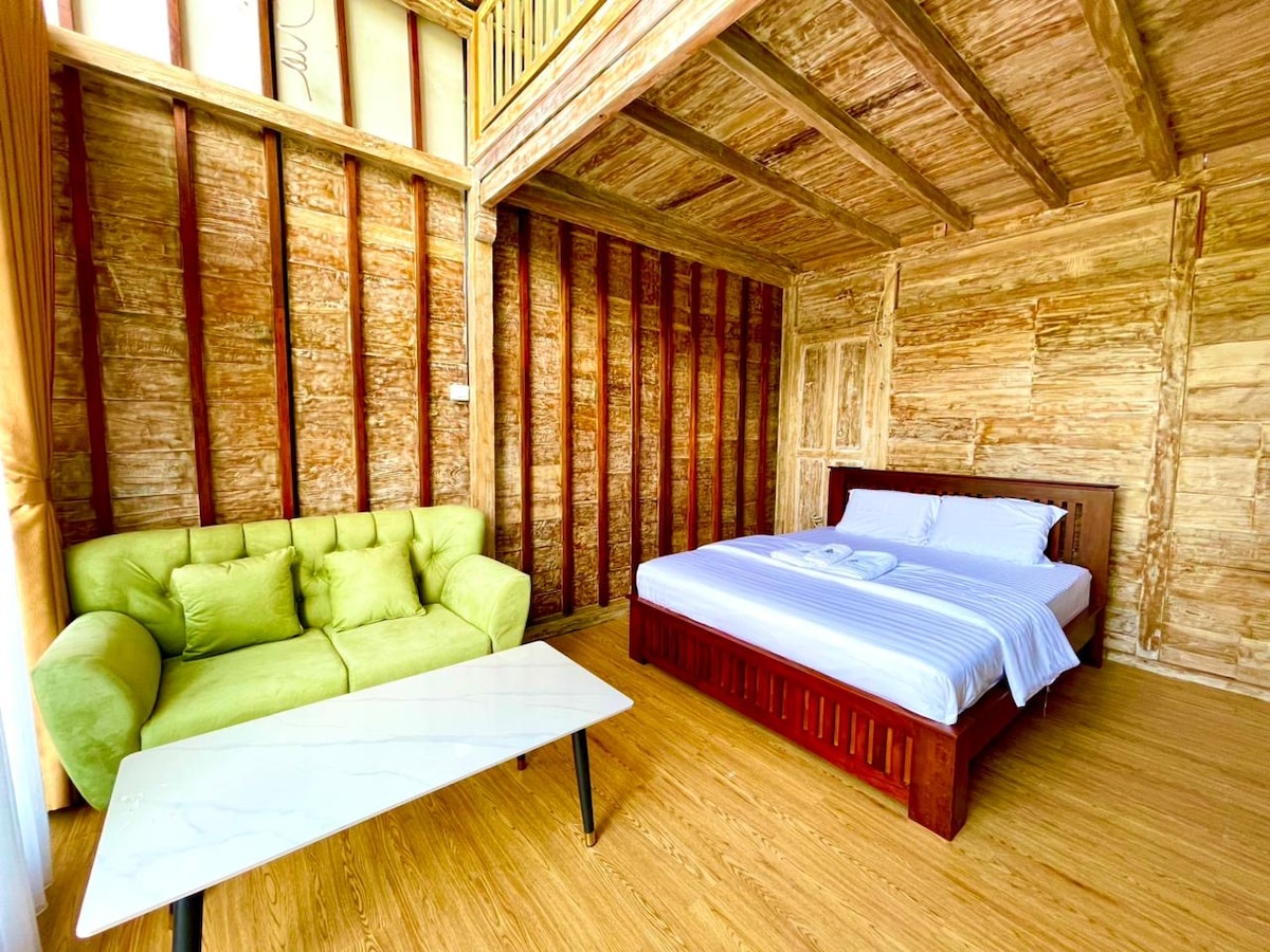 Cette chambre élégante et unique est le point de départ d'un séjour inoubliable. Vous pourrez profiter d'une magnifique vue sur la montagne depuis la fenêtre de la chambre. Cette chambre est équipée de la climatisation, du Wi-Fi, d'un chauffe-eau, d'un séchoir à cheveux, d'un très grand lit (king size) et d'articles de toilette. La salle de bain a une armoire à l'intérieur. Vous pouvez utiliser la cafetière, le micro-ondes, le réfrigérateur et la cuisinière dans notre cuisine commune. Vous pouvez aussi utiliser notre espace de travail dédié au premier étage. Lit supplémentaire disponible pour 100 000 IDR par nuit