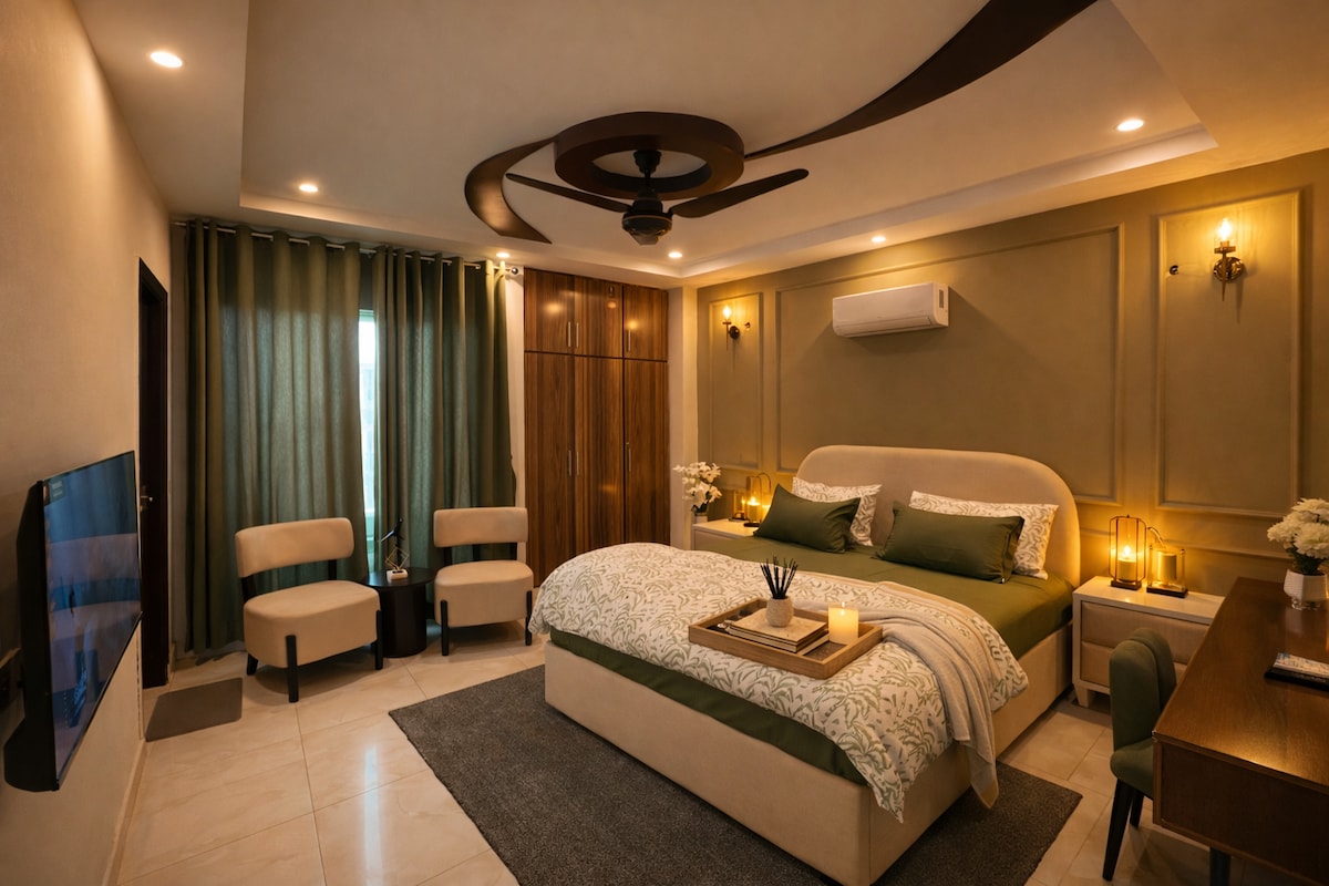 Bienvenue à Daró, un appartement-boutique d'une chambre au design avant-gardiste au cœur de Zameen Aurum, Gulberg III. Conçu avec soin avec des tons doux, un mobilier moderne et une ambiance calme semblable à celle d'un hôtel, cet espace offre un balcon privé, un salon élégant avec une télévision à DEL de 55 po, une cuisinette entièrement équipée, une connexion Wi-Fi rapide, des draps frais et de l'eau chaude 24 h/24 et 7 j/7. Idéal pour les couples mariés, les voyageurs d'affaires, les escapades d'une fin de semaine et les séjours longue durée à la recherche de confort, de commodité et d'une expérience vraiment élevée à Lahore. 🌙✨