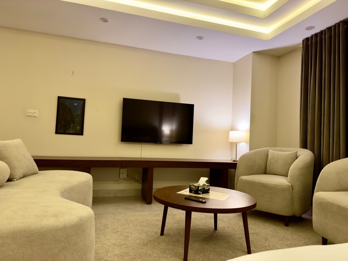 Enjoy a peaceful and luxurious stay in this centrally located studio apartment. Featuring a king-size bed with fresh sateen linens, a 55 inch smart TV, and 5G internet, it’s perfect for adults seeking comfort. Relax on the 5-seater sofa or enjoy the rooftop TKR restaurant. Free parking, stocked bathroom essentials, welcome basket, and kitchen basics included. Gym, sauna, and steam available at an extra charge. Quiet hours 11pm–7am. Parties and unmarried couples not allowed.