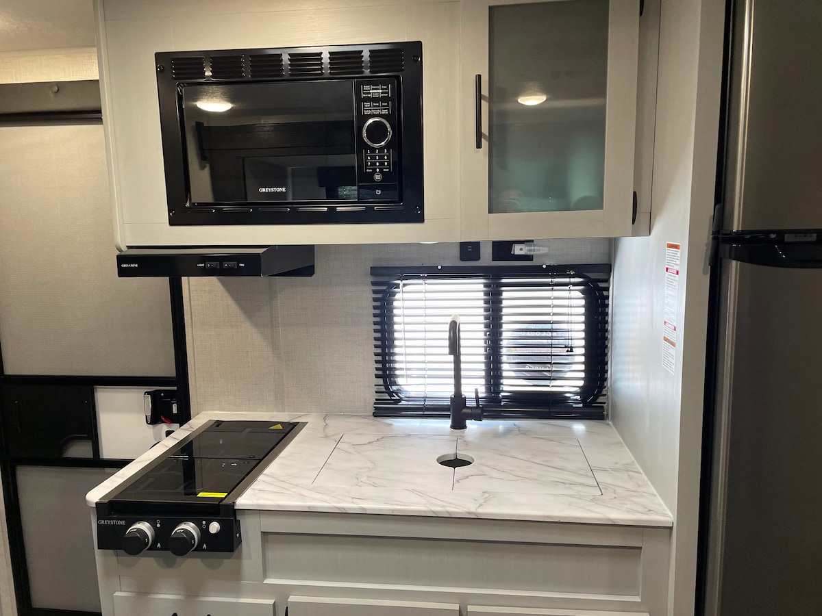 Nouveau camping-car avec lits superposés pleine grandeur et une glissière. Parfait pour un court séjour d'une soirée ou un voyage d'une semaine. Le lit Queen Size Murphy se replie pour dormir. Coin repas en forme de U pour beaucoup de sièges et aussi un espace de couchage. Équipé de la climatisation, d'une télévision, d'un réfrigérateur, d'un four à micro-ondes, d'une cafetière Keurig et de brûleurs à gaz. N'hésitez pas à nous contacter si vous avez des questions!