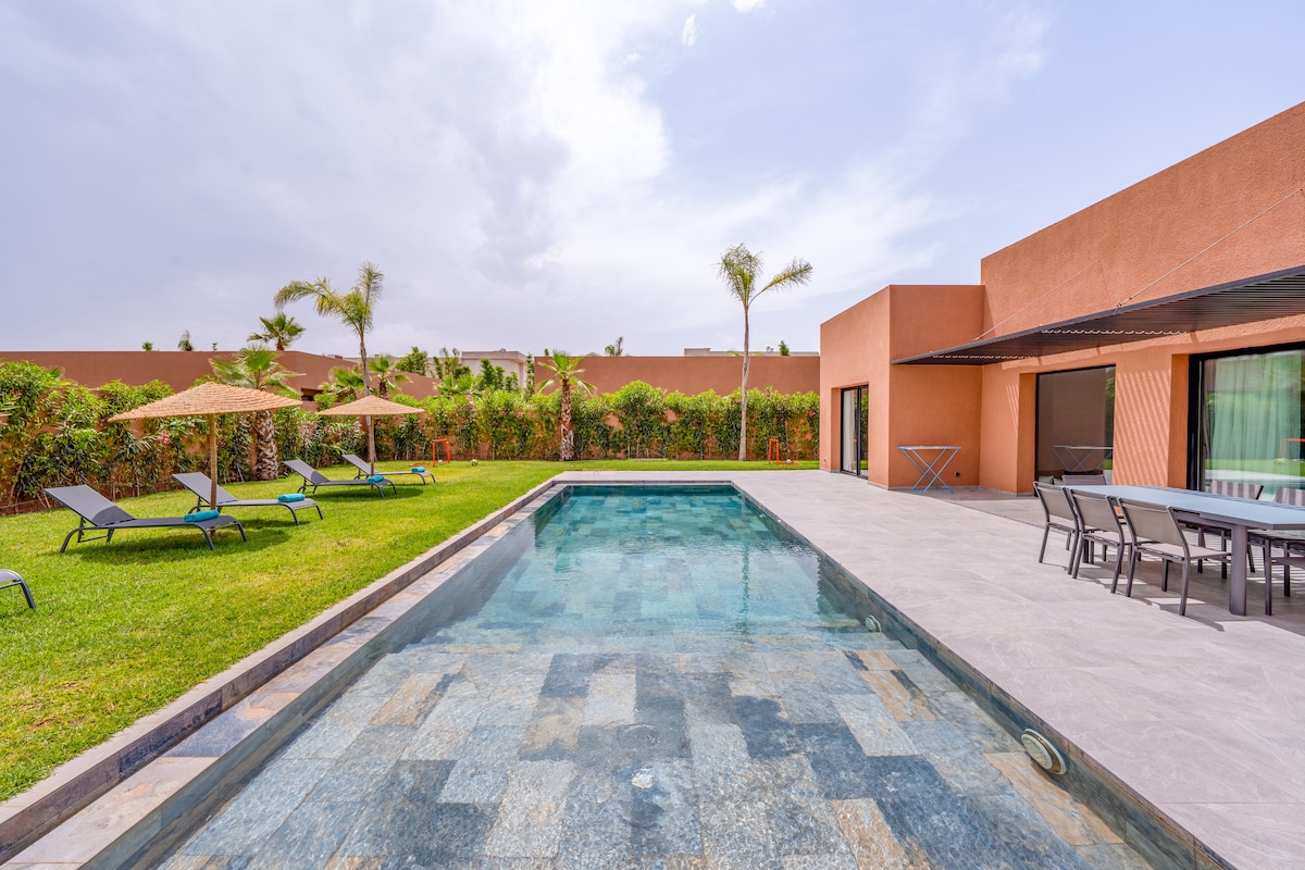 ✨Villa Inès : L'élégance à l'état pur✨ 💎 Petit-déj OFFERT chaque matin ! 🏊 Piscine Chauffée (7x4m) au cœur d'un jardin paysager. 🏸 Volleyball, Badminton & Ping Pong. 🏡 Domaine sécurisé 24h/24, 15 min du centre & 5 min des Golfs. 👩🍳 Gouvernante & Chef Privé pour vos repas sur-mesure. 🛏 4 Suites King d'exception, TVs avec Netflix, IPTV. 🚿 Douches à l’italienne, linge premium & sèche-cheveux. 👶 Kit Bébé complet (Lit, poussette, chaise) ✨L'art de vivre à Marrakech.✨Envoyez-nous un message!