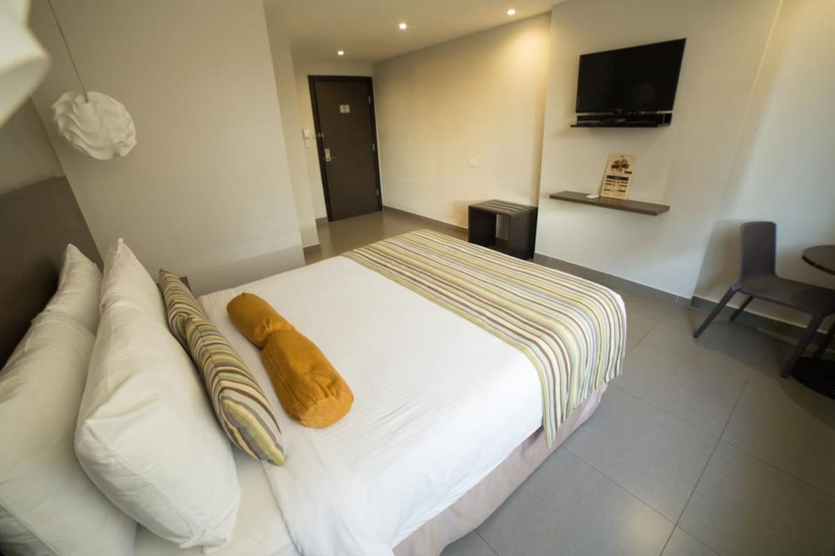 Somos un alojamiento inaugurado en Octubre del 2020 ubicado en el centro de la Ciudad de Panamá. Tenemos varios tipos de habitaciones, en este caso, se trata de habitación con 1 cama doble. Ofrecemos servicio de recepción continuo, Wifi de alta velocidad, área de trabajo compartida, sala con máquina expendedora de snacks y café y seguridad las 24 horas. Nuestras habitaciones están totalmente equipadas con baño privado con agua caliente, escritorio, aire acondicionado y televisión por cable.
