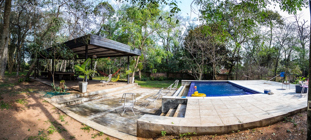 Profitez de la piscine avec cascade, détendez-vous dans le jacuzzi... Préparez des viandes/poisson/pizza/repas typiques dans le barbecue et le four à tatakuá et profitez de la table en bois/sous les arbres. Climatisation dans la chambre et dans la cuisine/salon 2. Le réservoir de 1000 litres assure l'alimentation en eau. Aide pour les excursions. Le lac Ypacaraí est à seulement quelques km.