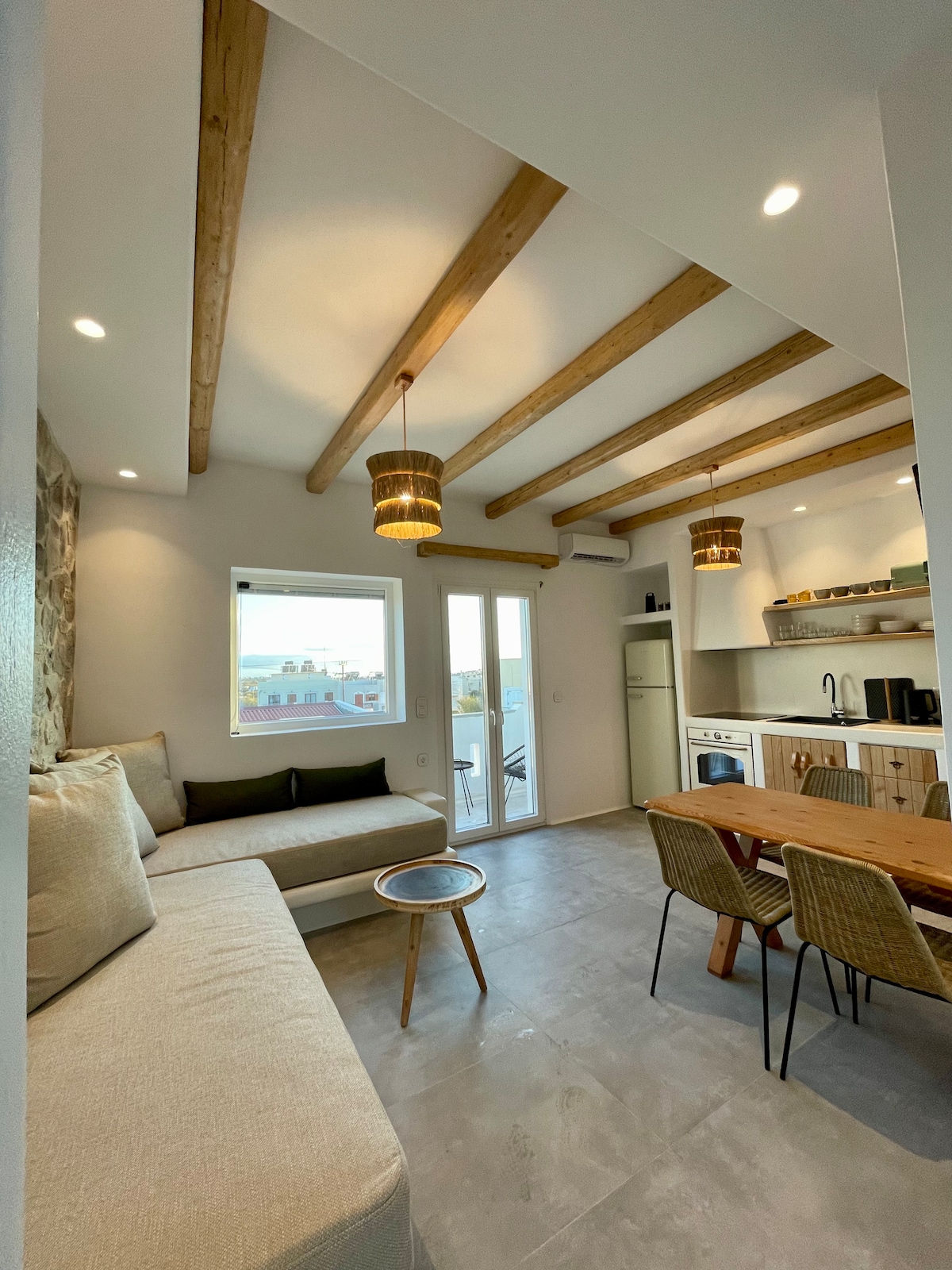Ouvrez une bouteille de vin à une table de bistrot privée et profitez d'une vue paisible sur le soleil qui se couche derrière les maisons blanches emblématiques. Marchez pieds nus sur les sols frais en lauzes à l'intérieur de cet espace récemment rénové, puis regardez la télévision depuis le lit avant de vous endormir ! Appartement d'une chambre avec un lit queen size intégré avec un tout nouveau matelas, une connexion Wi-Fi haut débit, un climatiseur et une télévision. La salle de bain et la cuisine viennent d'être rénovées. La cuisine est entièrement équipée avec une plaque à induction double, un réfrigérateur, un évier et des ustensiles.