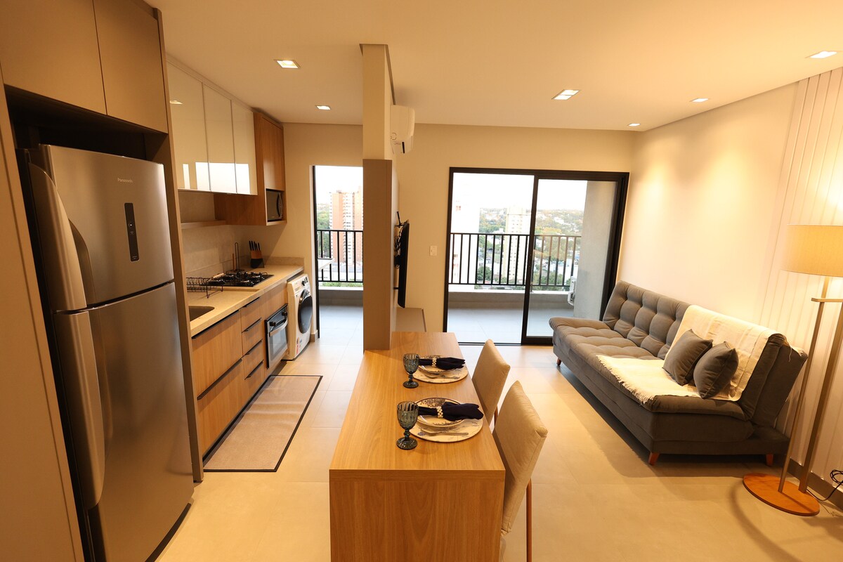 Détendez-vous dans un appartement avec jardin : joliment décoré, parfait pour les enfants et calme! Climatisation et ventilateur dans toutes les pièces, Wi-Fi, espace enfants, cuisine entièrement équipée, garage couvert et jardin privé de 20 m². - 1 chambre : lit queen size - 1 chambre : 2 lits simples, qui peuvent être joints - Chambre avec canapé, qui peut devenir un lit king-size En voiture, vous prenez : - 4 min Marco das Três Fronteiras et Yup Star - Shopping de 6 minutes à Catuaí - À 8 minutes du centre, des restaurants et des bars - 15 minutes hors taxes Argentine