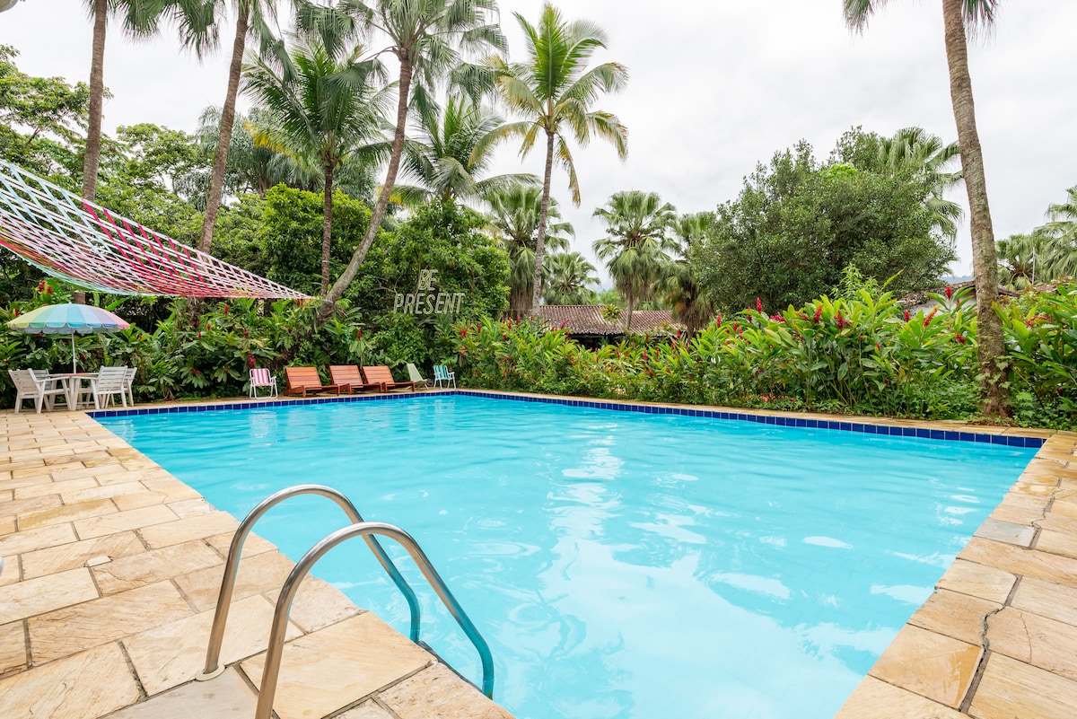 Suite (salle de bain privée) à quelques pas de la plage, équipée d'un minibar, d'un ventilateur, de linge de lit et de salle de bain (sur demande), d'une télévision, du Wi-Fi, de l'eau potable, d'une douche froide directement à la source et d'un parking sur place Situé à Trindade, quartier de Paraty. Nous sommes l'auberge la plus proche de la plage du Meio (à moins de 5 minutes), de la plage de Caixadaço, de la piscine naturelle et de la cascade. Nous sommes très proches de la rue principale (centre) . Ambiance familiale, avec beaucoup d'espace vert, idéal pour le repos et le contact avec la nature