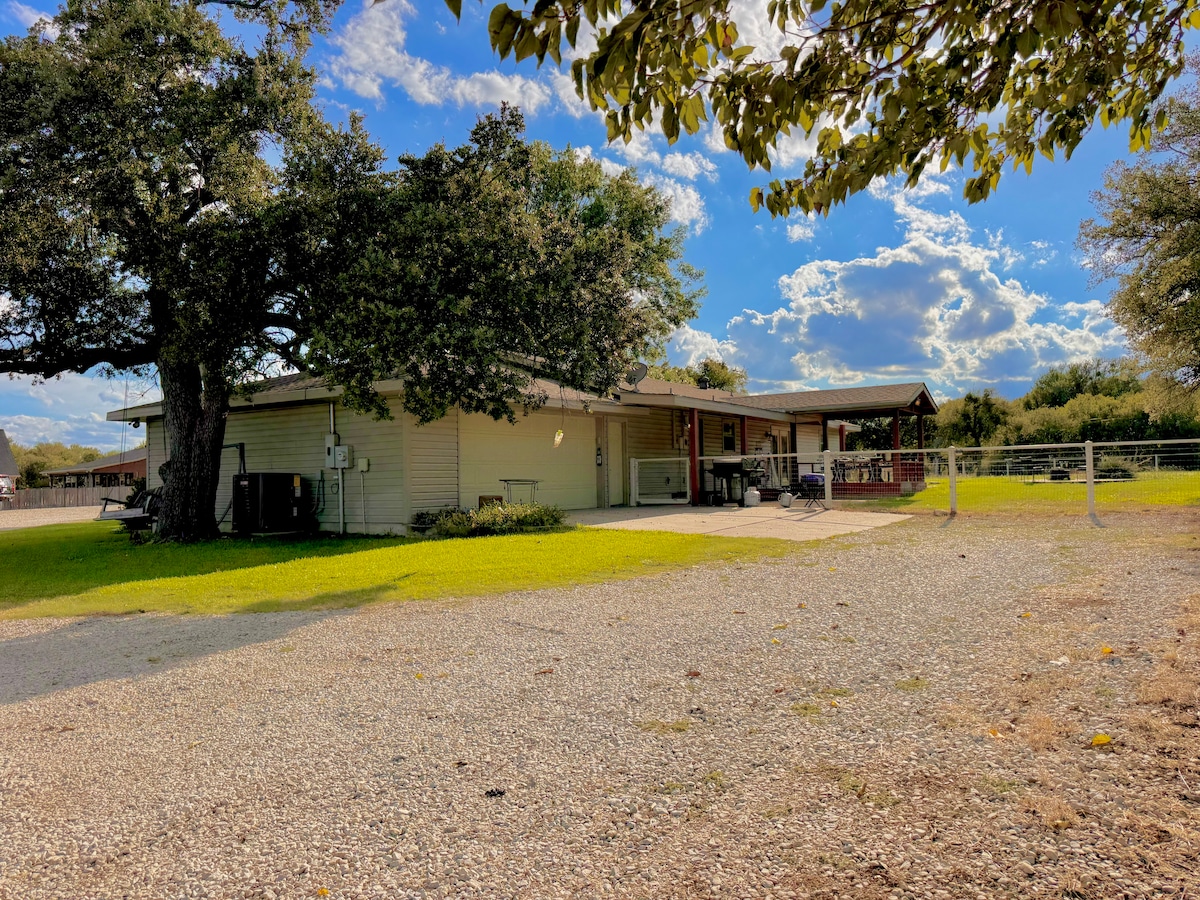 Bienvenue dans notre maison de 3 chambres entièrement rénovée nichée sur 5 acres de beauté sereine au cœur de Weatherford. Profitez de l'intérieur spacieux et des équipements modernes. Reposez-vous confortablement avec 2 lits King Size et un lit Queen Size ainsi que de grandes téléviseurs dans chaque chambre avec câble. Détendez-vous sur le magnifique porche ou rassemblez-vous autour du foyer pour observer les cerfs et les geais dans les vastes environs. Votre retraite parfaite vous attend, alliant confort, nature et divertissement dans une symphonie harmonieuse.