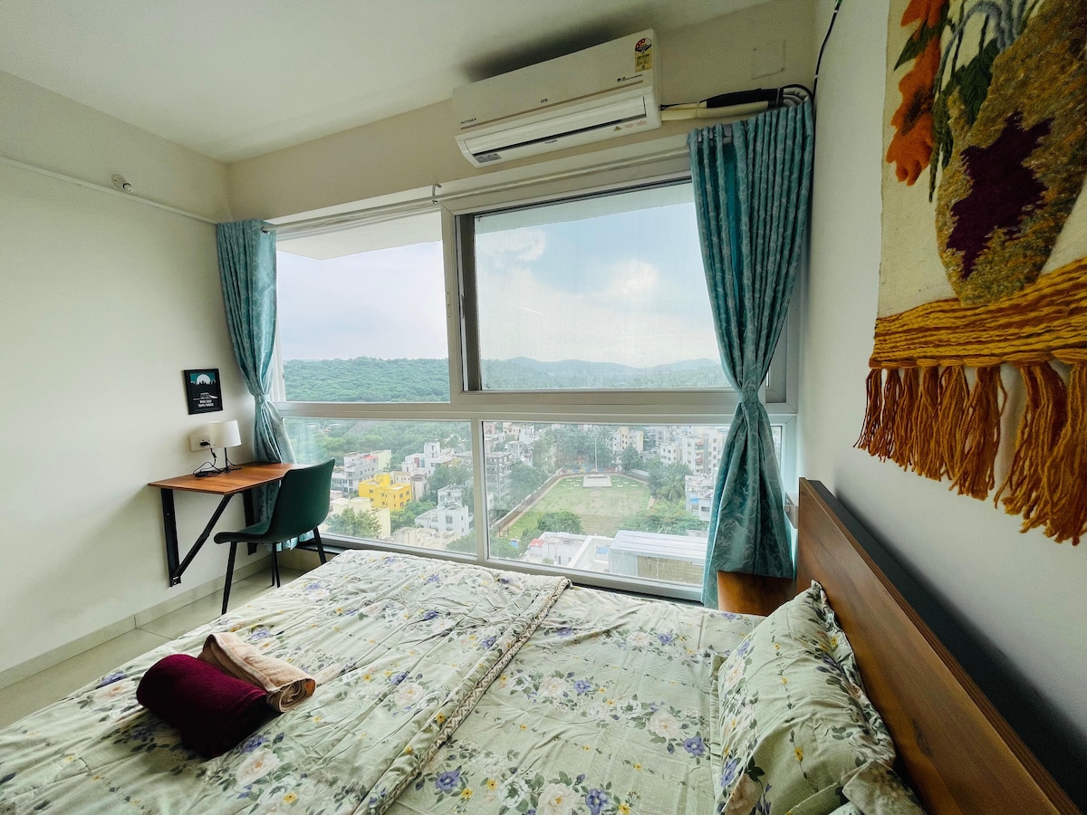 Bienvenus ! Cette retraite confortable offre une vue imprenable sur Baner Hills et est conçue pour le confort et la commodité. Vous aurez accès à la cuisine (plaque de cuisson à induction, réfrigérateur, bouilloire électrique), à un lit queen size confortable, à une télévision 32 pouces, à la climatisation, au Wi-Fi rapide et à un espace de travail dédié. Le bâtiment dispose d'une salle de sport, d'un studio Zumba, de salles de conférence et d'une terrasse avec une vue imprenable sur la ville. Nous sommes là pour rendre votre séjour agréable. N'hésitez pas à nous contacter si vous avez besoin de quoi que ce soit !