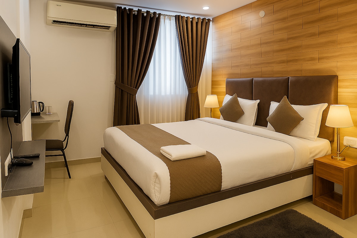 Entrez dans un espace chaleureux et accueillant au rez-de-chaussée, juste à l'avant de la maison.Cette chambre confortable est décorée avec des touches de bois classiques, un éclairage doux et une ambiance paisible, parfaite pour se détendre après une journée bien remplie. Situé au cœur de Patna, il est idéal pour les voyageurs en solo, les couples, les familles ou les escapades de courte durée, offrant une retraite sereine et chaleureuse où le confort et la commodité se rencontrent.