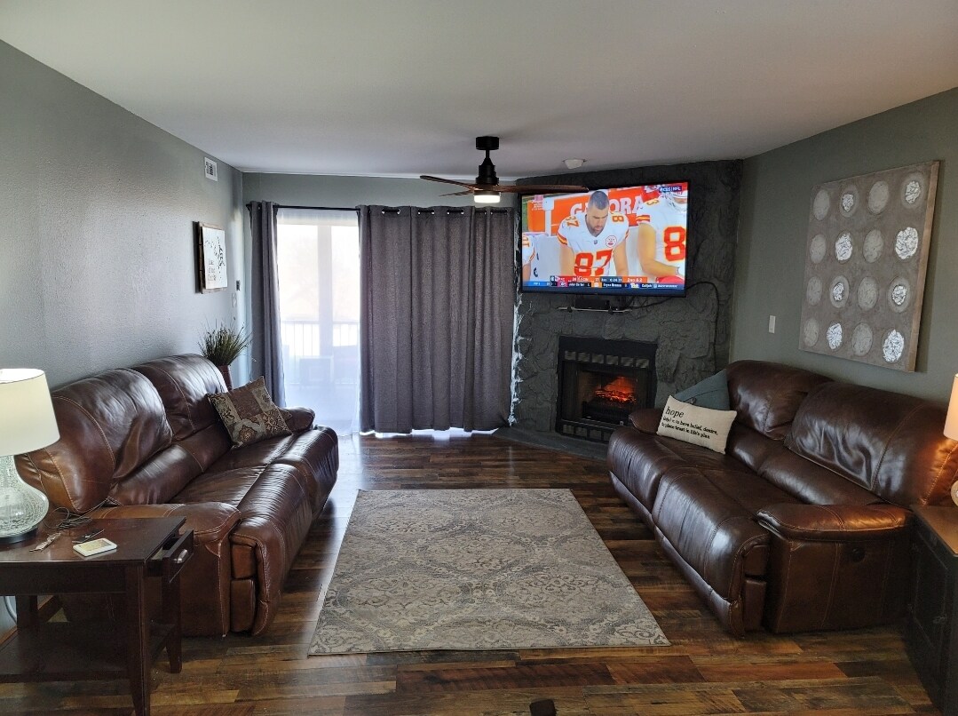 Superbe appartement d'une chambre avec lit king size situé à Osage Beach. Vue imprenable ! Couvert, terrasse abritée donnant sur le lac. Salle de bain SPA rénovée avec marbre italien. Parquet en bois dur partout. Emplacement de la crique/repère 21 miles. Les équipements comprennent une cale de mise à l'eau pour la location de bateau, la pêche, une cheminée et une piscine ! Beaucoup de bons restaurants, de superbes magasins et des activités amusantes à faire par terre/eau. Profitez toute l'année avec un chauffage de patio et un foyer électrique ! Disponible pour un bail à court/long terme, également
