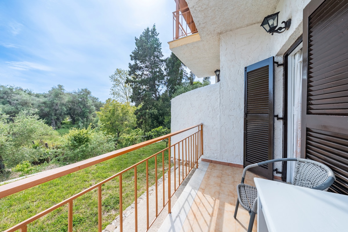 This property is a studio that includes a double bed and a bathroom with shower enclosure. The studio includes a wonderful setting of fully equipped kitchen and a living room all in one spacious environment. The windows face the garden and the amazing view of Lakka bay. Outside we have a nice terrace with amazing views of the bay and a private jacuzzi. You can use the shared pool and the shared sitting and dining areas with exceptional views.