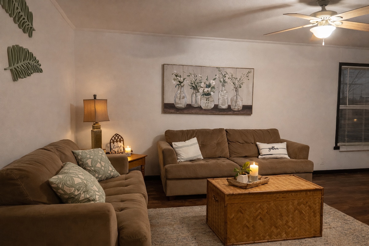 Soyez proche de tout - idéalement situé à 1 pâté de maisons de la rue principale - ce qui facilite la planification de votre visite. Notre maison intelligente dispose d'un plan d'étage ouvert depuis le coin repas et le bar à café avec un Kuerig, à travers la cuisine jusqu'au salon avec des téléviseurs roku et des lits Queen Size confortables dans chaque chambre, le Wi-Fi, un lave-linge/sèche-linge, une zone clôturée privée avec grille et foyer - le Roadrunner est entièrement équipé avec toutes les commodités de la maison pour votre séjour. Sensation d'intimité dans une maison située au centre.