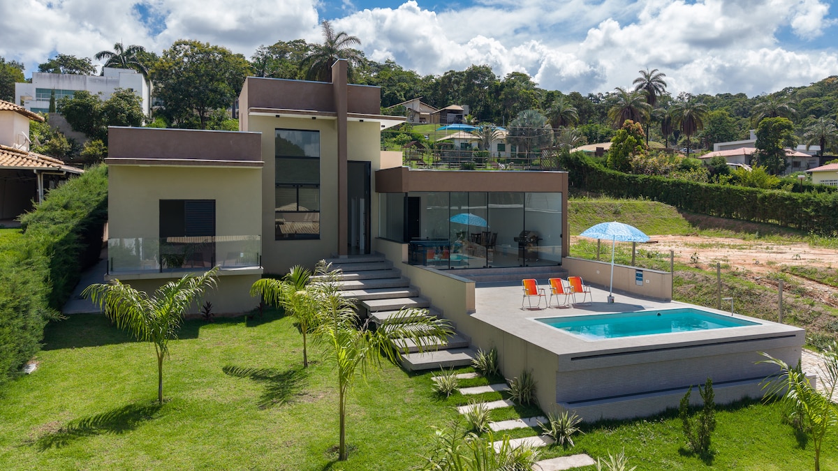 Maison pour les loisirs et le repos, bien ventilée, avec piscine chauffée par le soleil, espace gourmet avec barbecue avec grill, cuisinière à bois avec four, four à pizza, plan de travail avec plaque de cuisson, cheminée extérieure portable, wi-fi par câble d'excellente qualité, 04 chambres indépendantes et 04 salles de bains pour bien servir tout le monde. Toute la zone est clôturée et sécurisée pour votre animal de compagnie... Situé au km 55 de Mg 10, en direction de Serra do Cipó. Condominium fermé avec sécurité et portier 24h/24.