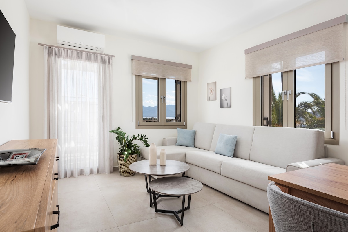 Hera a deux niveaux : La première, accueille un salon, une cuisine ouverte, une chambre double qui s'ouvre sur une petite cour et une piscine privée. La seconde dispose d'une autre chambre, qui s'ouvre également sur sa propre petite cour. Les deux niveaux ont un WC avec douche. Les deux étages sont reliés par un escalier intérieur. Grandes fenêtres coulissantes, terrasses protégées du soleil et du vent. Un logement idéal toute l'année, où les voyageurs peuvent profiter de la beauté de chaque saison.