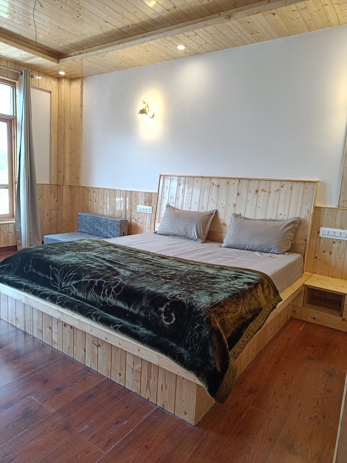 🏡 Admirez la tranquillité de la montagne à Rubaroo, un endroit où vous aimerez être ❤️ Détendez-vous dans notre spacieux chalet en bois avec un lit king size moelleux et un balcon unique en forme de L avec deux points d'entrée. Située au premier étage de notre villa de montagne, votre chambre offre une vue sur le lever du soleil le long des sommets lointains. Découvrez le mélange parfait de charme rustique et de confort. Profitez de repas faits maison, de nuits ✨étoilées et d'une véritable hospitalité de montagne dans notre village serein près de Jibhi 🌄