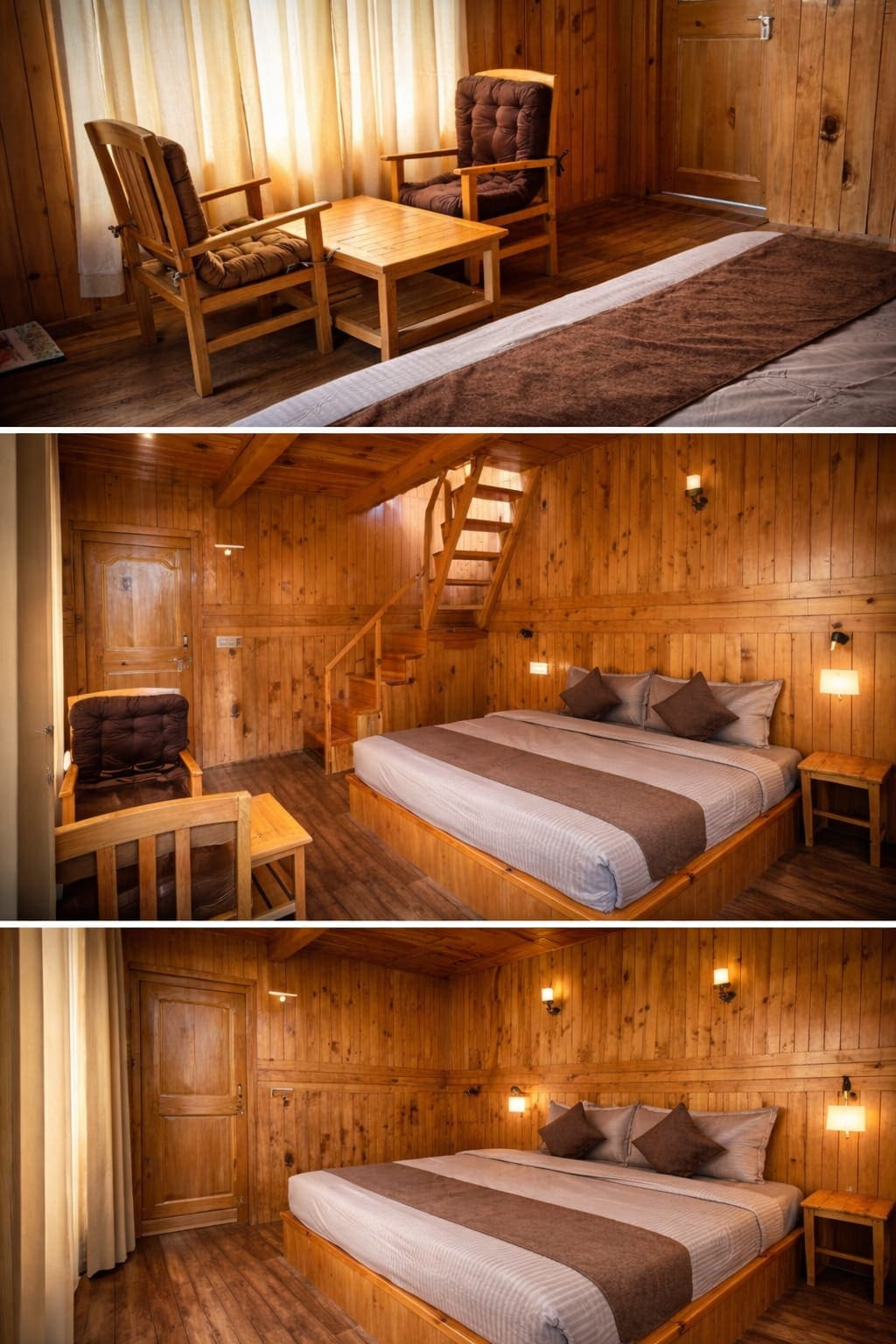 The Family Suite at Ayesha’s Fairytale Cottage in Tirthan Valley, Himachal Pradesh, is a cozy retreat for families. It features a spacious living area with a double bed and an indoor fireplace, perfect for chilly evenings. A charming wooden attic upstairs offers another double bed and a fun children’s play area. Enjoy scenic views from the private balcony and savor local dishes at the in-house café and restaurant. Nestled in Banjar, Kullu, it’s a serene escape for nature and comfort lovers.
