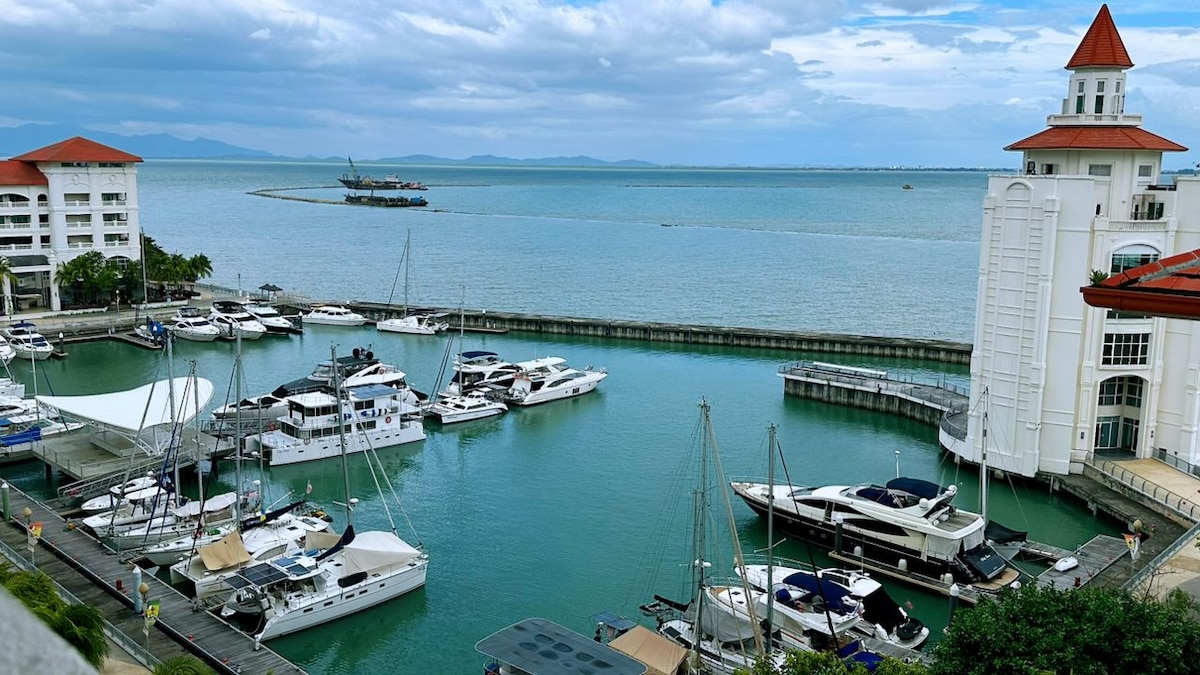 • VUE MER PANORAMIQUE À 180° • Vue sur le lever du soleil • Vue sur le pont de Penang • Au bord de la mer. • 1200 pieds carrés. • 1 parking privé • WiFi 100 Mbit/s • 30 restaurants, cafés, pubs, Starbucks, Coffee Bean, Subway, 7-Eleven sont au niveau 2 de notre maison • Entièrement climatisé (avec plafonnier) • Des forfaits de visites sont disponibles. • À 5 à 10 minutes en voiture de Chew Jetty et de la vieille ville classée au patrimoine mondial de l'UNESCO.