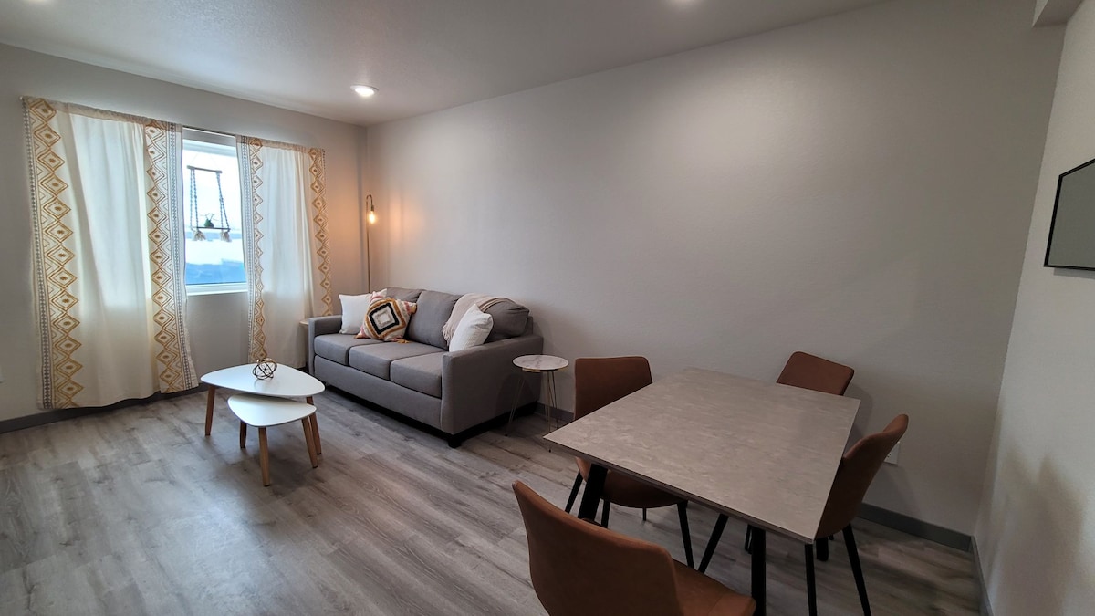 Lofts modernes dans le centre-ville de Custer, Dakota du Sud ! Près du mont Rushmore, du parc d'État de Custer, du sentier Mickelson, du mémorial Crazy Horse, du parc national de Wind Cave, de Jewel Cave, à distance de marche des boutiques, des brasseries et des restaurants. Cet appartement dispose de 2 chambres, 1 salle de bain, un canapé-lit, une cuisine entièrement équipée, un coin repas et un espace de rassemblement. Vous aurez une vue sur le centre-ville, parfait pour les défilés du 4 juillet et les Gold Discovery Days. Parking gratuit et recharge gratuite des véhicules électriques.
