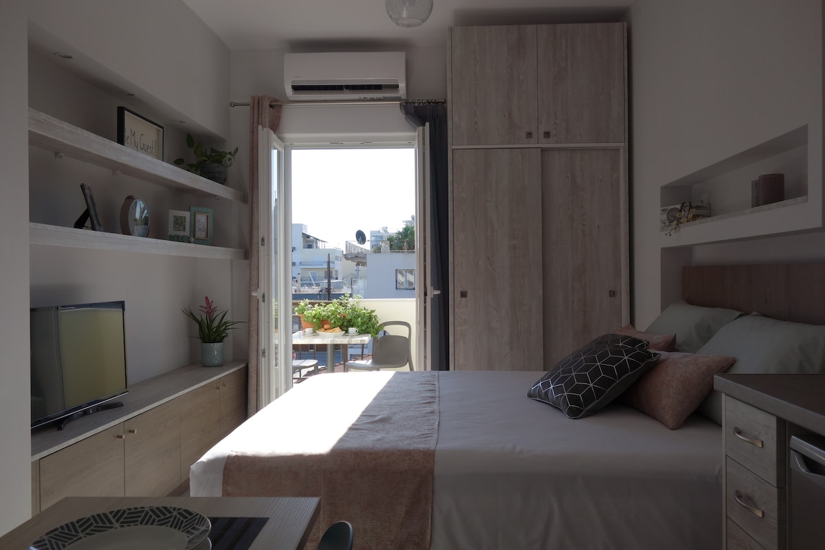 Blue Sky Studio est un petit studio pour 2 personnes Équipé de toutes les choses nécessaires pour des vacances relaxantes. Ce studio offre une vue sur la rue depuis le balcon, mais comme vous pouvez le voir sur les photos, l'emplacement est idéal car la distance à la plage de sable est minime. Il est à proximité des supermarchés, des restaurants, des cafés et des transports en commun. Ici vous avez une cuisine, un grand lit double confortable, une salle de bain avec douche, sèche-cheveux, serviettes et linge de maison.