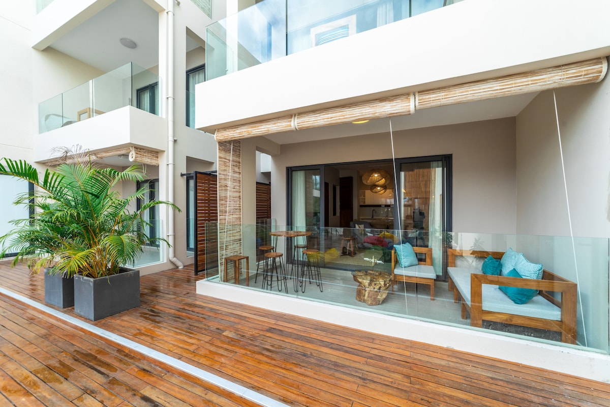 Votre appartement au 1er étage dans une nouvelle petite maison d'hôtes. Il dispose de 2 chambres, 2 salles de bains, un salon, une cuisine et un patio privé. Vous pourrez profiter de la piscine chauffée sur le toit, de la salle de sport et de la table de pique-nique. Situé à proximité des plages privées et des hôtels-boutiques. L'appartement dispose d'une grande terrasse privée avec barbecue, de sièges extérieurs et d'un accès à une deuxième cuisine et un deuxième espace extérieurs. Les restaurants et hôtels locaux sont à quelques pas seulement. Climatisation dans toutes les pièces. Le Point aux Canionniers se situe entre la plage de Mont Choisy et Grand Baie.
