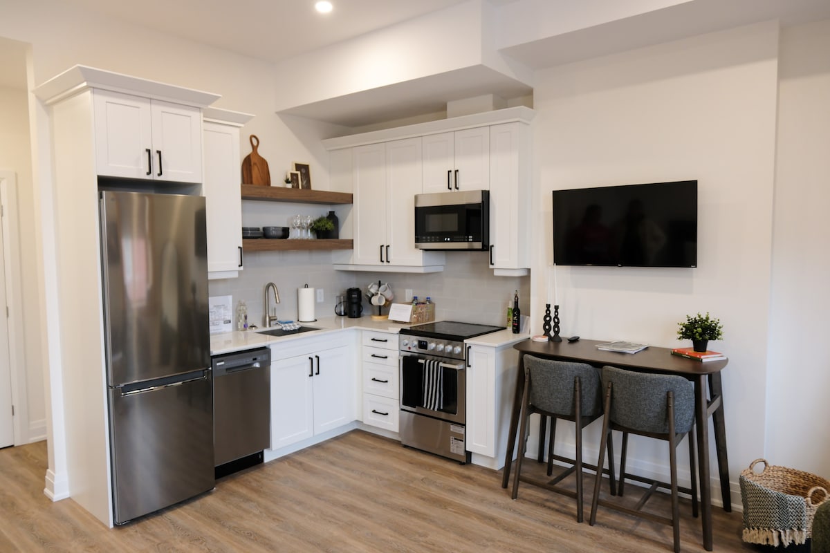 Situé au dernier étage, avec vue sur le centre-ville, notre condo de 450 pieds carrés se trouve à quelques pas du cœur du centre-ville de Stratford et de tout ce qu'il a à offrir, y compris des cafés confortables, des restaurants élégants, le théâtre Avon, à proximité du célèbre festival Stratford, et d'autres boutiques pour tous les goûts. Parfait pour une escapade en couple ou pour profiter entre amis voyageant ensemble. Notre condo offre tous les éléments essentiels, y compris un lit Queen Size luxueux, une cuisine entièrement équipée, une télévision intelligente de 55 po et une buanderie attenante.