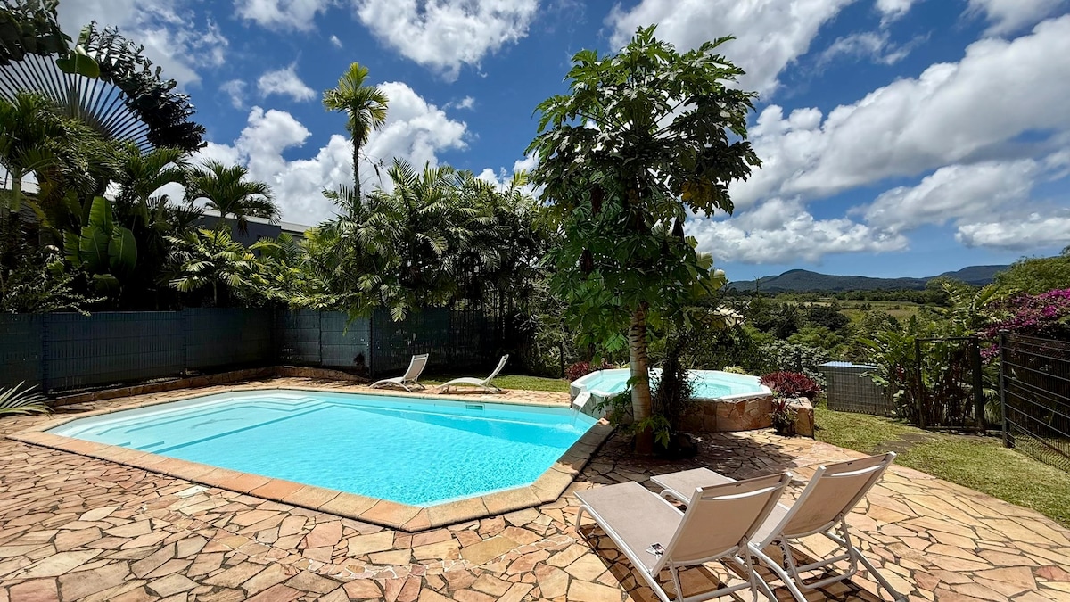 Superbe environnement très reposant. Invitation à la déconnection ! Très beau bungalow avec piscine privative, vue mer. 40 m2 avec douche à l italienne , belle chambre, terrasse couverte avec kitchenette + un deck de 50m2 équipe de transats. Barbecue à disposition. .De belles randonnees à faire dans dans la jolie campagne environnante ( rivières, cascades, parc floral.) ou dans la région . Le bungalow est à 15mn de la mer, 15mn de l Aeroport et 10mn des centres commerciaux .