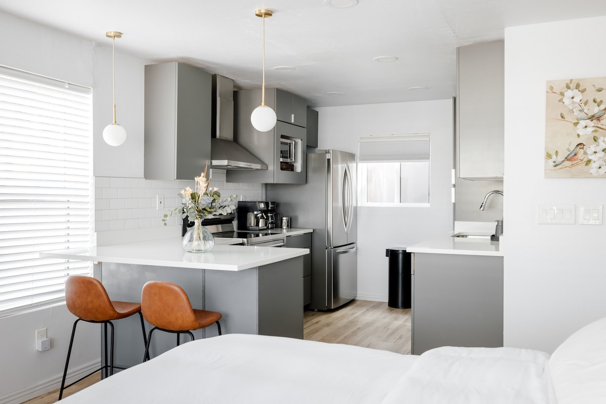 Profitez d'un studio élégant et central. Ce studio spacieux d'une chambre et d'une salle de bain est parfait pour un couple ou un voyageur solo. Les équipements comprennent une cuisine entièrement équipée, un bar à café, une télévision connectée, une connexion Wi-Fi, des jeux, un lave-linge séchant empilable et un petit patio avec gril et foyer. À distance de marche des destinations culinaires populaires Little Miss BBQ, The Vig, Timo Wine Bar et Sushi Friend. Idéalement situé à 15 minutes de l'aéroport de Phoenix Sky Harbor et à 25 minutes du State Farm Stadium.