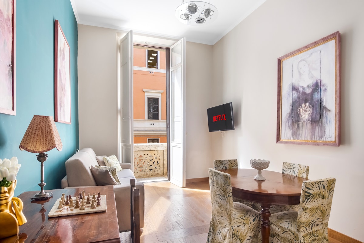 Retraite ✨paisible près de la fontaine de Trevi✨ L'avantage d'être au cœur de la ville, mais loin du chaos. Près de toutes les attractions historiques de Rome, à quelques pas de la fontaine de Trevi, mais niché dans un palais serein du XVIIIe siècle. Ce joyau caché offre un patio privé luxuriant et une cour arrière, parfaits pour se détendre après une journée d'exploration, où l'agitation de la ville s'estompe dans le bruissement des feuilles. Que ce soit pour une escapade romantique, une aventure ou pour vous détendre, découvrez la beauté de Rome en toute tranquillité.