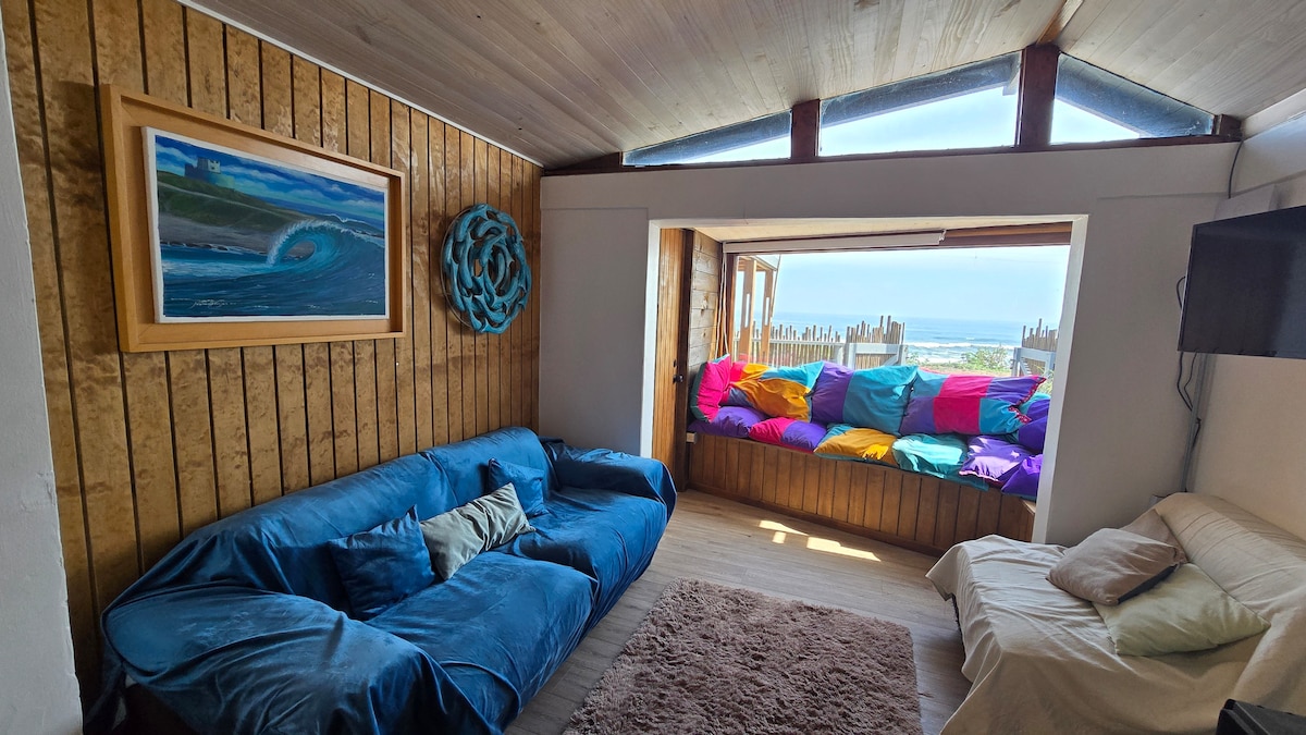 Loft Punta de Lobos est un loft moderne situé à 1 000 mètres au-dessus de Punta de Lobos, au Chili. Il peut accueillir 4 personnes, extensible à 6 avec notre tarif flexible. Profitez d'une vue imprenable sur la mer et d'une paisible forêt de cyprès, à seulement 100 mètres du Surf Lodge. Le loft dispose d'une chambre principale avec une salle de bain privée, ainsi que de deux futons/canapés-lits et de lits superposés à l'étage. À l'extérieur, vous trouverez un espace barbecue avec un gril, un foyer, une table à manger et un minibar. À l'intérieur, des sangles en corde sont disponibles pour les planches de surf.