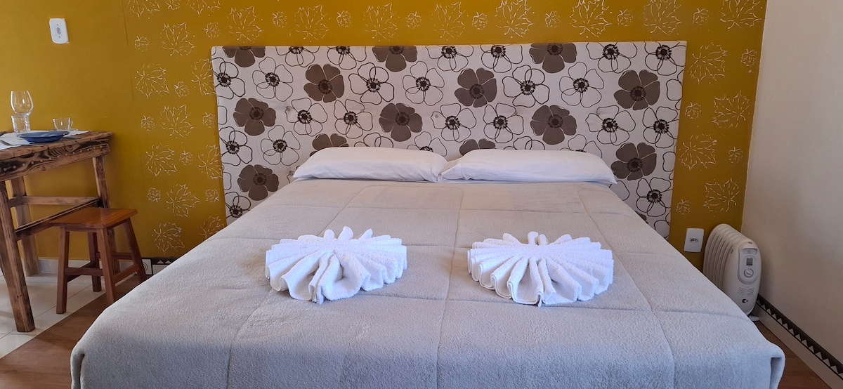 Appartement pour les couples à la recherche d'un espace confortable et chaleureux. Situé dans le centre commercial de Campos do Jordão, idéal pour la randonnée et un accès facile aux autres sites touristiques. Lit double confortable, douche chauffée et vue sur la montagne. La famille d'accueil prépare tout avec beaucoup de soin pour recevoir les invités. La suite est située sur un terrain partagé et l'accès se fait par un portail électronique et individuel avec clé. La famille est attentionnée et garantit l'intimité.